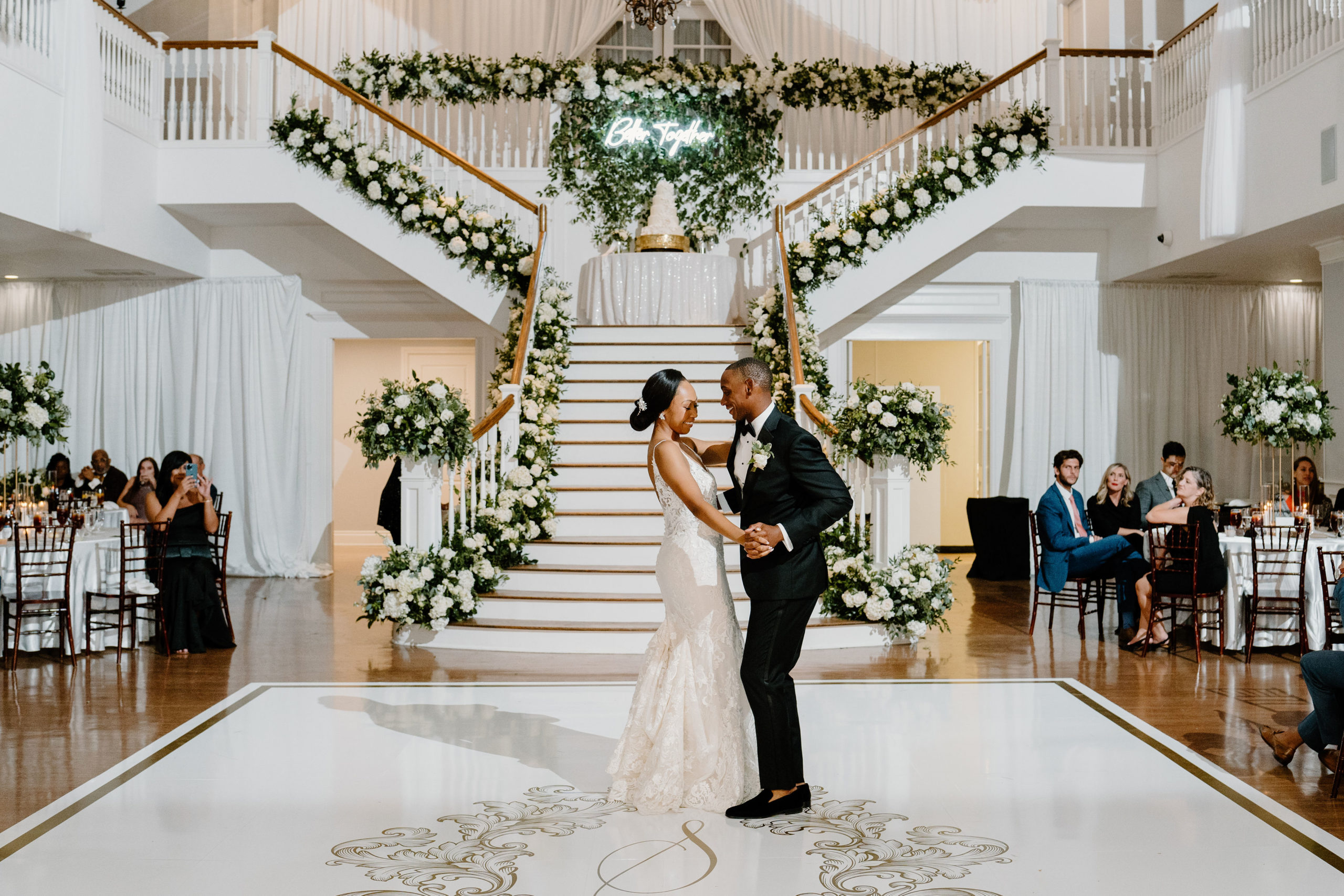 The grand staircase was adorned with the most stunning mix of white flowers and minimal greenery for filler that were the perfect décor for a fall wedding. We love the idea of the flowers being on both sides of the stairs—not just the inside railing but the outside as well.